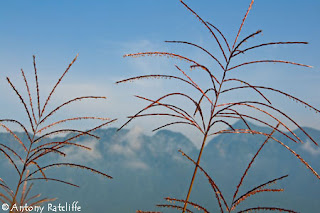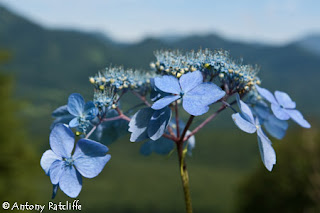 As you can see, beautiful wild flowers, wild Hydrangea growing on the overgrown Ski slopes along with some wild asters and what would be called in the UK - Ornamental grasses. Togakushi Mountain range is in the background.