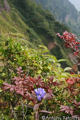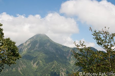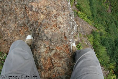 Still there is no avoiding the second section which is known as Tsurugi no Ha-Watari (剣の刃渡り), the Swords Blade Crossing, the picture below is of a Japanese guy who was going back down the way I came, highly unusual way to do the trek as it is more treacherous than making ones way across the ridge and down to Bokor Jo or The Cow Ranch. As can be seen he preferred shimmying or shuffling his way across as opposed to crawling on all fours. The picture is taken with a wide angle lens so it gives a false impression as to the width of the Swords blade (knifes edge). The other picture is of me straddled over the knifes edge with the accompanying drop to one side, the other side that is not in the shot is almost exactly the same!!