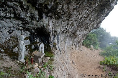 From Okusha Shrine the well marked and well trodden (though can be slippery when wet) route rises steeply through the forest, many big old Japanese Beech trees (Fagus Japonica - Buna in Japanese) line the path. It's not long before one comes across a huge overhanging rock, Gojikken Nagaya (五十間長屋) next you approach a small shinto shrine within an overhanging cliff face Hyakken Nagaya (百間長屋). At This point the clouds started rolling and I began to imagine the worst and that all hopes of seeing stunning vistas from the top (when I eventually reached there) would be dashed due to the cloud formations.