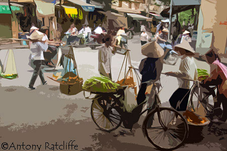 Such is the habit of the Vietnamese people for transporting saleable items by way of bamboo pole and bamboo baskets that some say the country has the same form, a long strained and bent bamboo pole (refering to the length of the country) with a bamboo basket hanging off of either end (which would be the chunky parts of the country to the north and south). I have no reason to argue with them over this point, it certainly looks as though it could be the case.