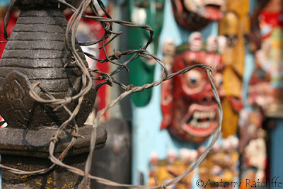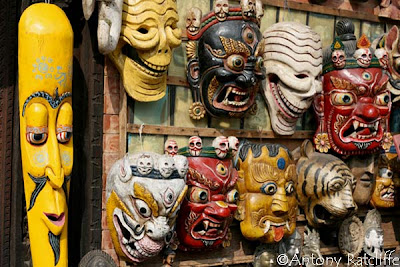 What really interests me about Swayambhunath is all the religious garb and paraphernalia around the hilltop complex, lots of interesting bits and pieces, nik naks if you like. Such as masks ABOVE, wood carved by craftsman and to do with the superstitions that plague religions. There are stores selling a vast array of demon and devil masks to ward off evil BELOW.