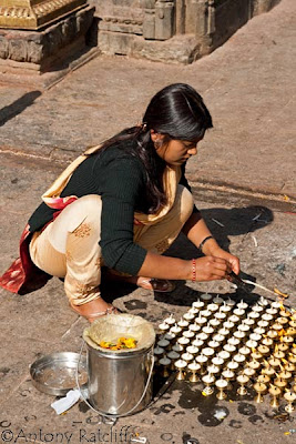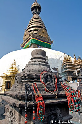 Other things of interest at Swayambhu are the little rituals that devotess and pilgrims partake in. Praying at the temple, worshipping lord Buddha or their Gods if they happen to be Hindu's, lighting incense and small butter lamps, feeding the monkey's, bargaining for a good price on the Tibetan Buddhist antiquities or other Nepali souvenirs. It is quite a hive of activity almost everyday.