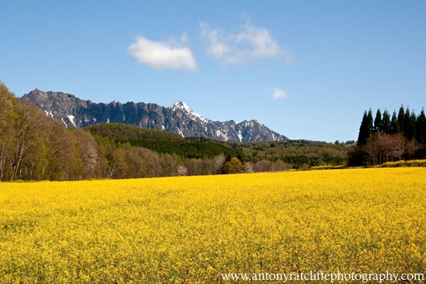 Joshinetsu National Park is a volcanic area situated at 1200m a.s.l and located at the foot of two extinct volcanoes, Mount Togakushi and Mount Iizuna. The Highlands here abound in natural beauty with a huge variety and diversity of alpine plants blooming in season. There are mountains, lakes, ponds and marshes with regard to the landscape, all of which visitors have easy access to. Crops also can be quite a spectacle when they are as vibrantly coloured as the rape seen in the picture above and cultivated on such a large scale.