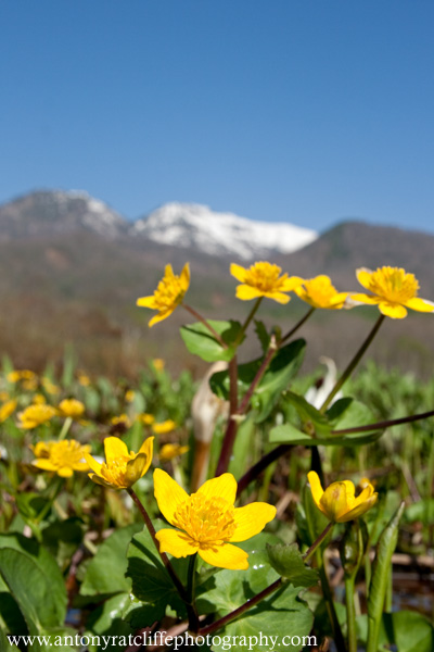 Furu Ike is another great place to view the Asian Skunk Cabbage along with its loving companion plant the Marsh Marigold. The walk around the lake and through the forest is interspersed with boardwalks although they are somewhat aged and decayed these days. In places it is pretty marshy but this environment proves all the more beneficial to certain species of wild flowers. And at a few spots along the walk you can also see Salamander eggs in the water at this time of year.