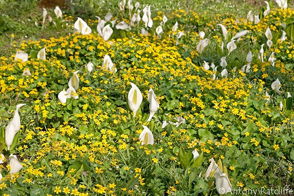 Asian Skunk Cabbage (Lysichiton camtschatcense) and Marsh Marigold (Caltha palustris)