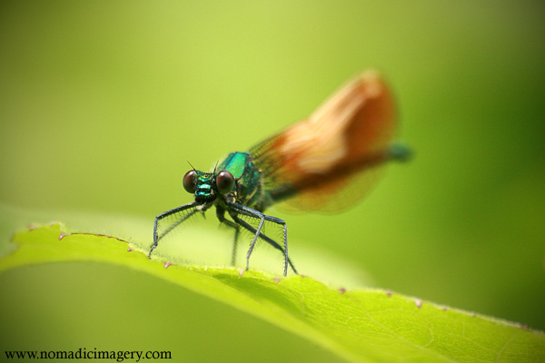 This is one of the larger Damselflies I came across in Japan. In Japanese the name is Kawa Tombo ( カワトンボ ) and in English it is known commonly as the Beautiful Demoiselle (Calopteryx virgo). She is female which is distinguished by the metallic green body and iridescent brown wings. These skittish creatures are quite tricky for photographers to get a good shot of because they move around in such a frantic manner but if you have the patience to watch and wait sooner or later they will warm to you.