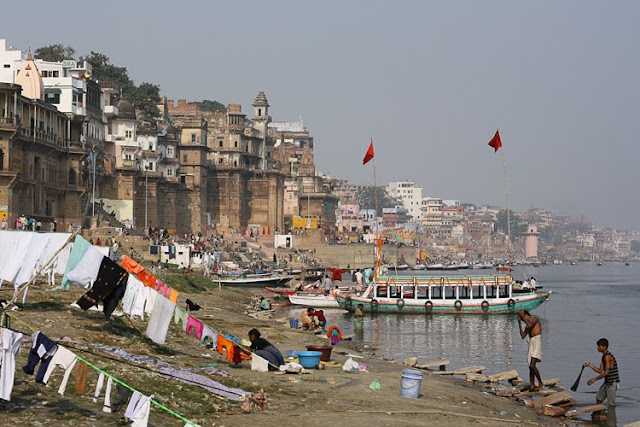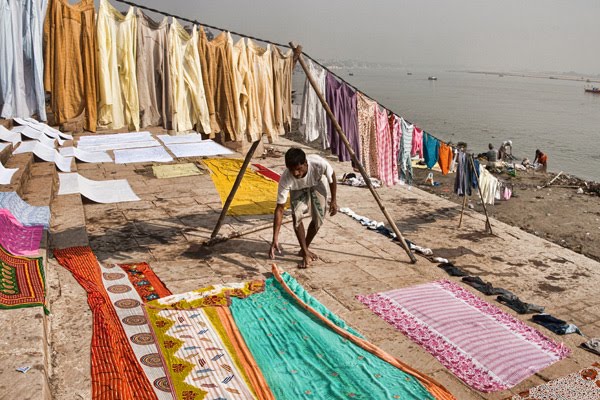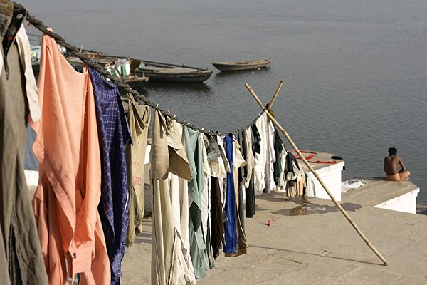 The holy water from the Ganges River has another very important role, to be used for washing the millions of sari's and other clothes that are constantly being subjected to the dust and dirt of the surrounding environs. Laundry duties are performed in the river just as frequently as the devout perform ablutions. All along her banks the Dobhi Wala's or laundrymen can be seen scrubbing and whacking worn clothes on an old rock beside the river, ringing them out and drying them on the filthy steps YET the mystery remains how after it has dried in the mid-day sun it has become so spotlessly clean! Definitely one of life's mysteries.