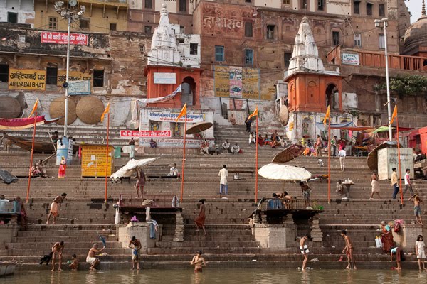 Boat rides can be had for a reasonable rate and you will get a superb view from the river of all that occurs on the ghats. The devout could be sat meditating or reading the scriptures, others will be cleansing themselves in Ganga Mata's water, religious ceremonies will be being held and temple bells will be ringing, you will pass water buffalo up to their necks in the river keeping cool and see some chap making cow shit patties and sticking them to any available surface to dry out.