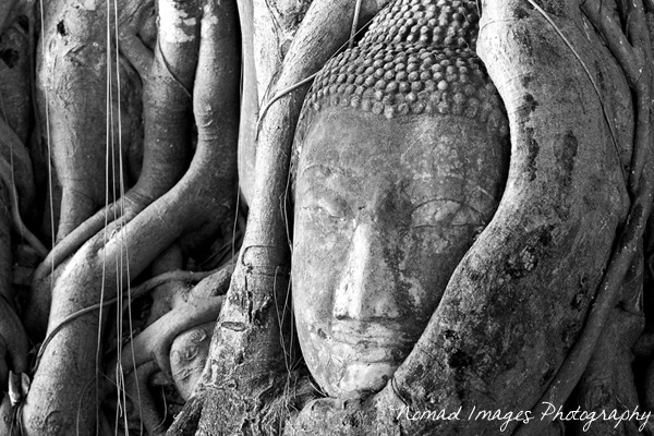 This must be one of the more famous Buddhist relics within Thailand known to the outside world at Wat Mahathat in Ayutthaya. Nobody really knows how long this stone carved buddha head has been entombed as it were amongst the tree roots of an ancient banyan but it's obviously a very long time!