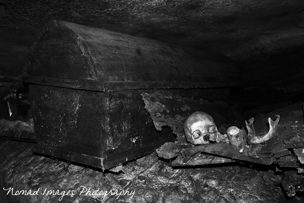 Coffins in a rotting state of disrepair, some stacked several high in an erratic fashion and yet others open revealing bones and what not along with many skulls straddling the uneven cave walls of the dark damp interior.